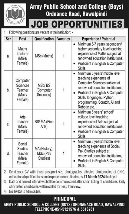 Vacancies in Army Public School & College APS&C Advertisement March 2025