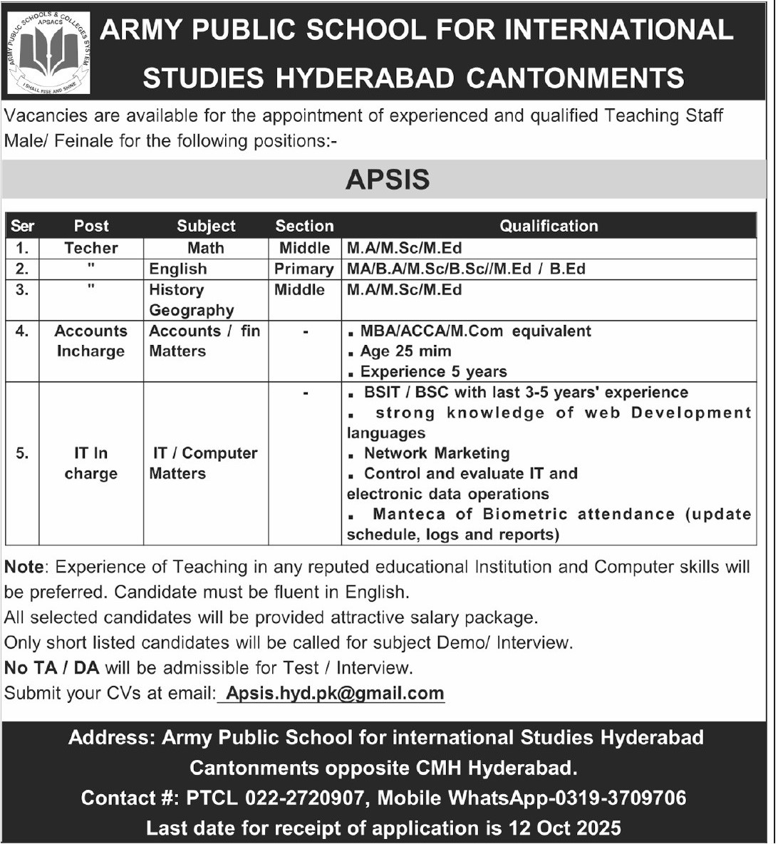 Army Public School for International Studies jobs advertisement dated about 6 October 2025 in daily Express Tribune Newspaper invites application for the vacant post of account incharge, english teacher, history teacher, teaching staff, it incharge and geography teacher in Hyderabad, hyderabad Sindh Pakistan. Candidates with Master, Bachelor, MS and MA etc. educational background will be preferred.