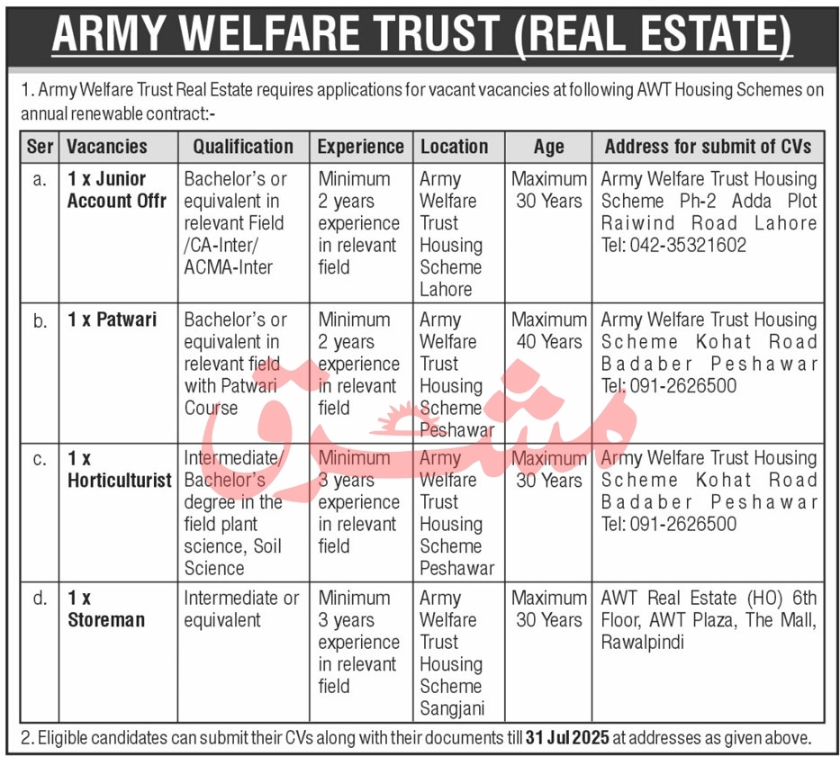 Vacancies in Army Welfare Trust Advertisement July 2025