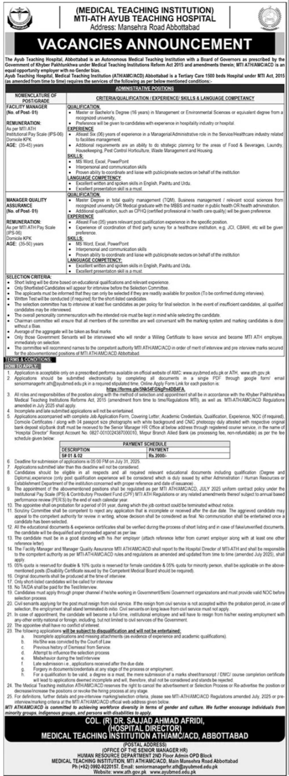 Vacant posts including facility manager and manager quality assurance are announced in Ayub Teaching Hospital ATH Abbottabad, abbottabad Khyber Pakhtunkhwa KPK Pakistan as per 10 July 2025 advertisement in daily The News Newspaper. Persons with MS, Bachelor and Master etc. education can apply.