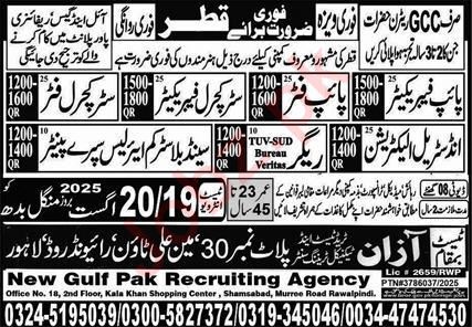 Azan Trade Test Center Qatar, qatar Qatar invites applications from eligible candidates for the post of Airless Spray Painter, Structural Fitter, Sand Blaster, Pipe Fabricator, Rigger, Industrial Electrician, Pipe Fitter and Structural Fabricator as per advertisement of August 18, 2025 published in daily Express Newspaper. Primary, Matric and Middle etc. educational qualification will be preferred.