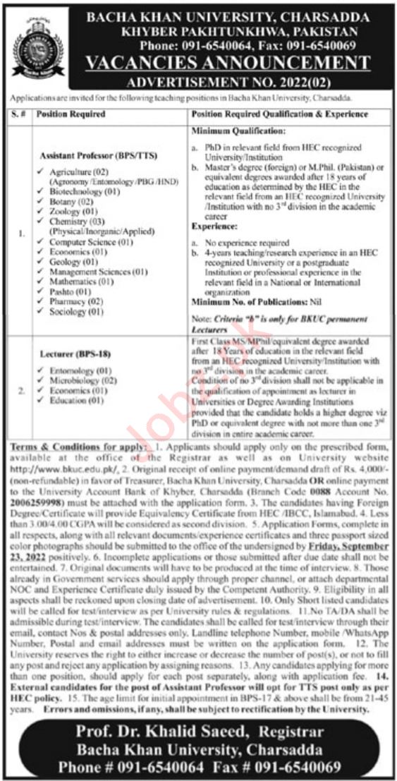 Bacha Khan University jobs advertisement dated about 5 September 2022 in daily Mashriq Newspaper invites application for the vacant post of assistant professor agriculture, assistant professor sociology, assistant professor math, assistant professor pharmacy, lecturer economics, assistant professor pashto, assistant professor biotechnology, assistant professor botany, lecturer entomology, assistant professor zology, lecturer micro biology, lecturer education, assistant professor geology and assistant professor computer science in Charsadda, charsadda Khyber Pakhtunkhwa KPK Pakistan. Preferred Education is Mphil, Bachelor, Phd and Master etc.