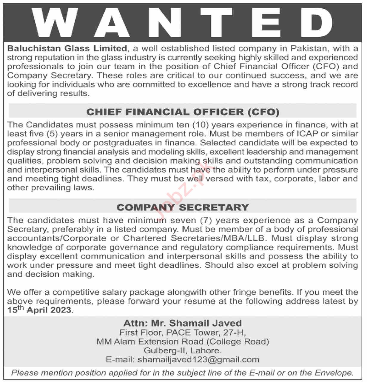 Baluchistan Glass Limited is looking for candidates for following posts as per job advertisement published in daily Dawn Newspaper of April 3, 2023 for location Lahore, lahore Punjab Pakistan: