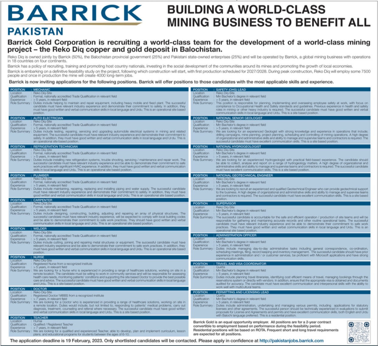 Barrick Pakistan jobs advertisement dated about 5 February 2023 in daily Jang Newspaper invites application for the vacant post of national hydegelogist, welder, plumber, carpenter, supervisor, safety lead, auto electrician, administration officer, doctor, nurse, permitting lead, mechanic, national geotechnical engineer, visa coordinator, refrigeration technician, teacher, national geologist, travel coordinator and licensing lead in Quetta, quetta Balochistan Pakistan. Educational qualifications required Bachelor, Matric, Intermediate and Master etc.