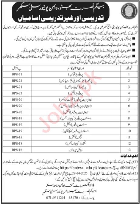 Vacancies in Begum Nusrat Bhutto Women University Advertisement April 2025