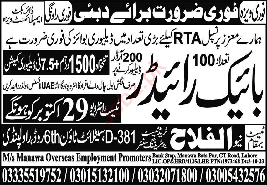 Vacant posts including bike rider are announced in Al Falah Trade Test Center UAE, dubai UAE as per 22 October 2023 advertisement in daily Express Newspaper. Matric etc. educational qualification will be preferred.