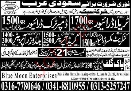 Blue Moon Enterprises Riyadh, riyadh Saudi Arabia invites applications from eligible candidates for the post of grader operator, dumper truck driver, buildozer operator, concert mixture driver and traila driver as per advertisement of December 18, 2023 published in daily Express Newspaper. Candidates with Middle, Intermediate and Matric etc. educational background will be preferred.