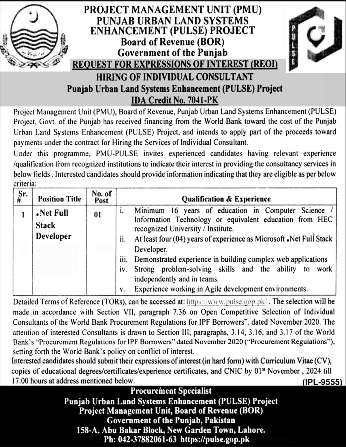Vacant posts including dot net stack developer are announced in Board of Revenue Lahore, lahore Punjab Pakistan as per 14 October 2024 advertisement in daily Nawaiwaqt Newspaper. Preferred Education is MS, Bachelor and Master etc.