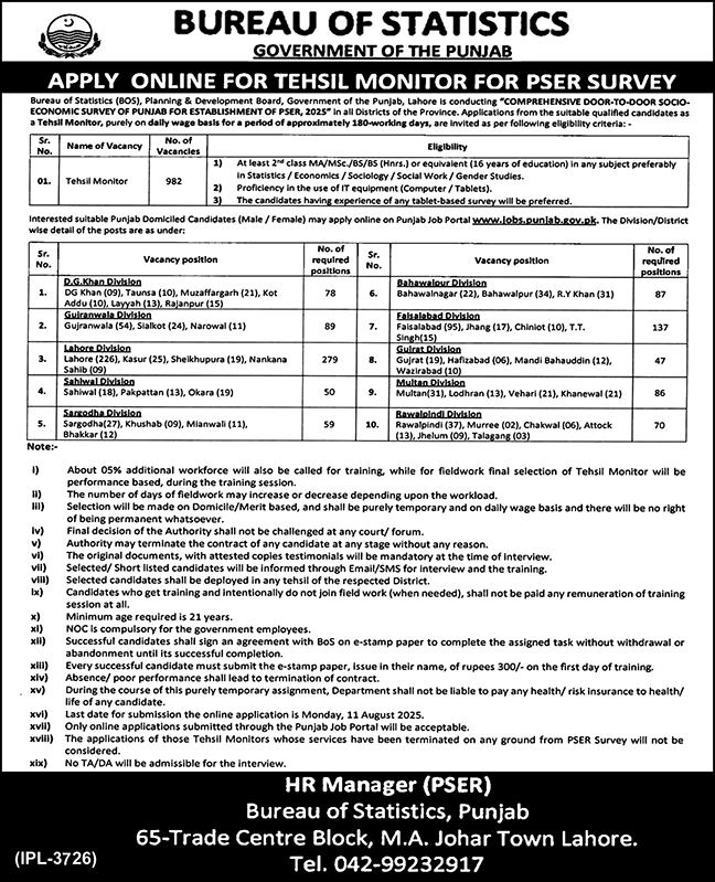 Bureau of Statistics Johar Town Lahore, lahore Punjab Pakistan invites applications from eligible candidates for the post of tehsil monitor as per advertisement of July 25, 2025 published in daily Nawaiwaqt Newspaper. Persons with MS, Master and Bachelor etc. education can apply.
