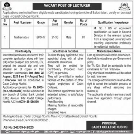 Cadet College is looking for candidates for following posts as per job advertisement published in daily Jang Newspaper of September 10, 2025 for location Nushki, nushki Balochistan Pakistan: