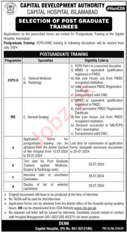 Capital Development Authority CDA jobs advertisement dated about 14 July 2024 in daily Jang Newspaper invites application for the vacant post of post graduate training program in Islamabad, islamabad Islamabad Pakistan. MBBS etc. educational qualification will be preferred.