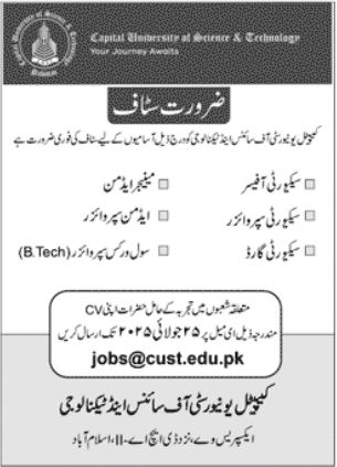 Vacant posts including Security Guard, Manager Admin, Security Supervisor, Civil Work Supervisor, Admin Supervisor and Security Officer are announced in Capital University of Science & Technology CUST - Select Area - Islamabad, islamabad Islamabad Pakistan as per 14 July 2025 advertisement in daily Jang Newspaper. Preferred Education is Middle, Matric, Bachelor and Intermediate etc.
