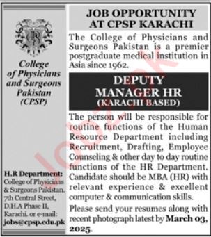 College of Physician and Surgeons Pakistan CPSP DHA Phase 2 Karachi, karachi Sindh Pakistan invites applications from eligible candidates for the post of deputy manager hr as per advertisement of February 16, 2025 published in daily Jang Newspaper. Educational qualifications required Master and MBA etc.