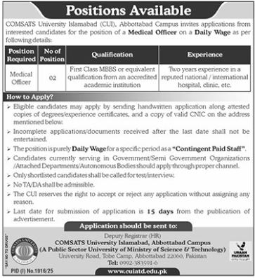 Comsats University Abbottabad, abbottabad Khyber Pakhtunkhwa KPK Pakistan invites applications from eligible candidates for the post of medical officer as per advertisement of September 4, 2025 published in daily The News Newspaper. Educational qualifications required MBBS etc.