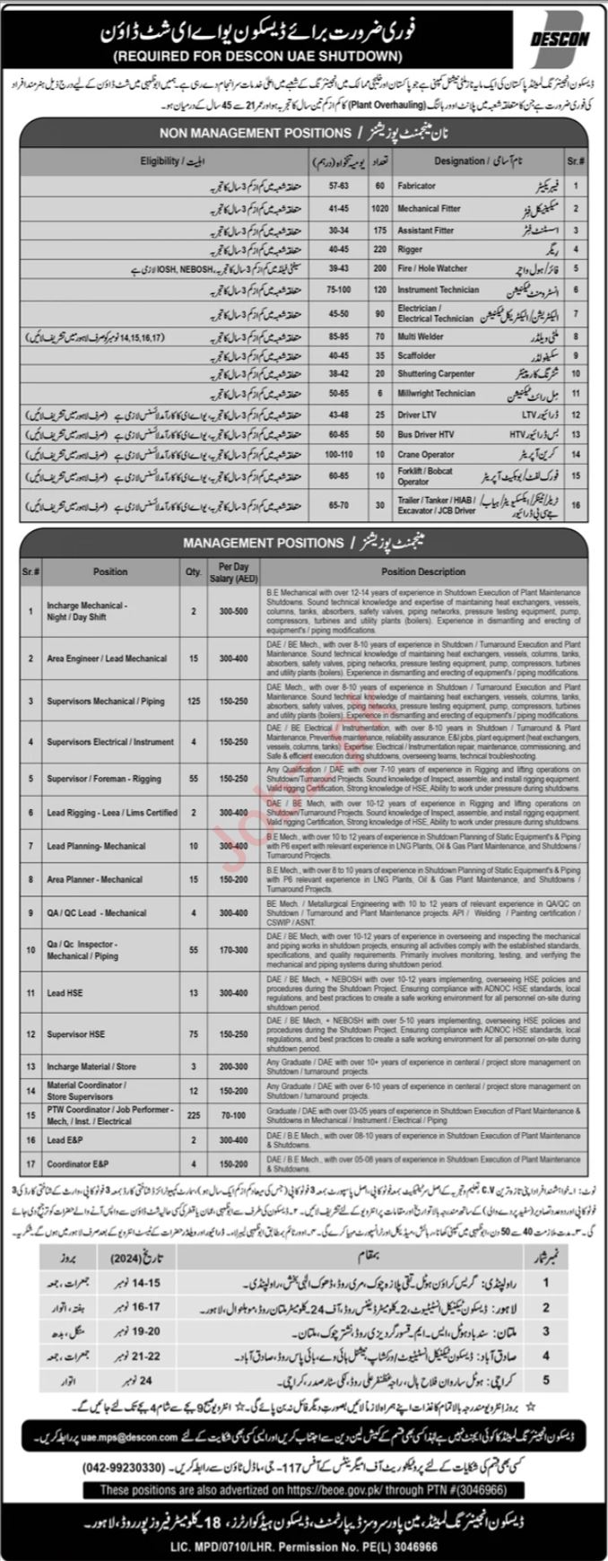 Descon Engineering Limited invites applications for job positions advertised in daily Jang dated 3 November 2024 for following vacancies in Abu Dhabi, abu dhabi UAE.