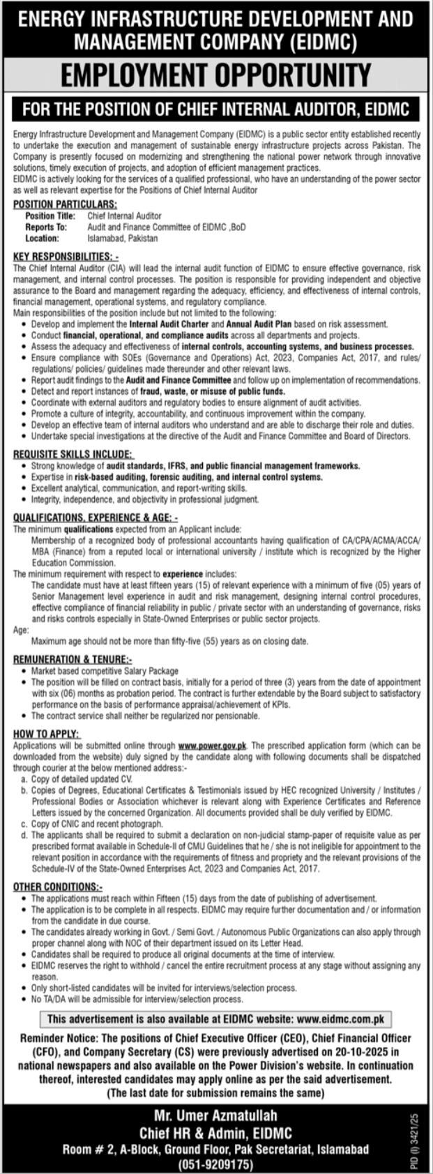 Energy Infrastructure Development & Management Company EIDMC jobs advertisement dated about 26 October 2025 in daily Jang Newspaper invites application for the vacant post of chief internal auditor in Islamabad, islamabad Islamabad Pakistan. Persons with Bachelor, MS and Master etc. education can apply.