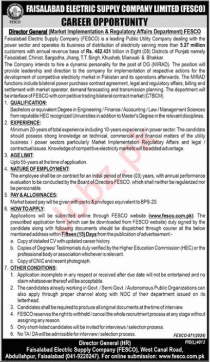 Vacant posts including director general are announced in Faisalabad Electric Supply Company Limited FESCO Faisalabad, faisalabad Punjab Pakistan as per 16 June 2024 advertisement in daily Jang Newspaper. Candidates with Bachelor, MS and Master etc. educational background will be preferred.