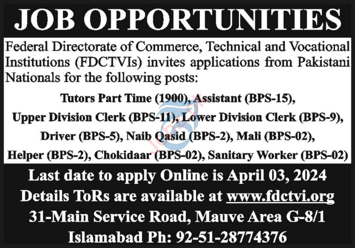 Federal Directorate of Commerce Technical & Vocational Institute FDCT is looking for candidates for following posts as per job advertisement published in daily Jang Newspaper of March 17, 2024 for location Islamabad, islamabad Islamabad Pakistan: