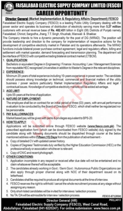 Faisalabad Electric Supply Company Limited FESCO Faisalabad, faisalabad Punjab Pakistan invites applications from eligible candidates for the post of director general as per advertisement of June 16, 2024 published in daily Jang Newspaper. Educational qualifications required Master, MS and Bachelor etc.