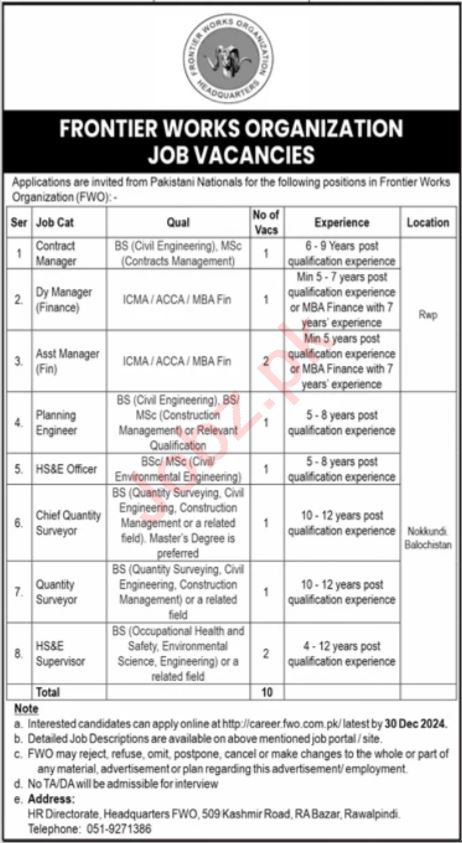 Frontier Works Organization FWO jobs advertisement dated about 15 December 2024 in daily Jang Newspaper invites application for the vacant post of Chief Quantity Surveyor, Hse Supervisor, Contract Manager, Quantity Surveyor, Assistant Manager Finance, Planning Engineer, Dy Manager Finance and Hse Officer in Chaghi, rawalpindi and chaghi Balochistan Pakistan. ACCA, Bachelor, MBA and Master etc. educational qualification will be preferred.