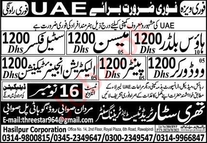 Hasilpur Corporation Abu Dhabi, abu dhabi UAE invites applications from eligible candidates for the post of steel fixer, electrician engineer technician, mason, wood worker, house builder and painter as per advertisement of November 13, 2023 published in daily Express Newspaper. Matric, Primary and Middle etc. educational qualification will be preferred.