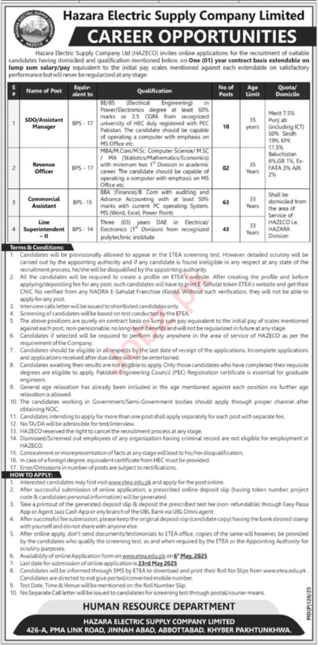 Vacancies in Hazara Electric Supply Company HAZECO Advertisement May 2025