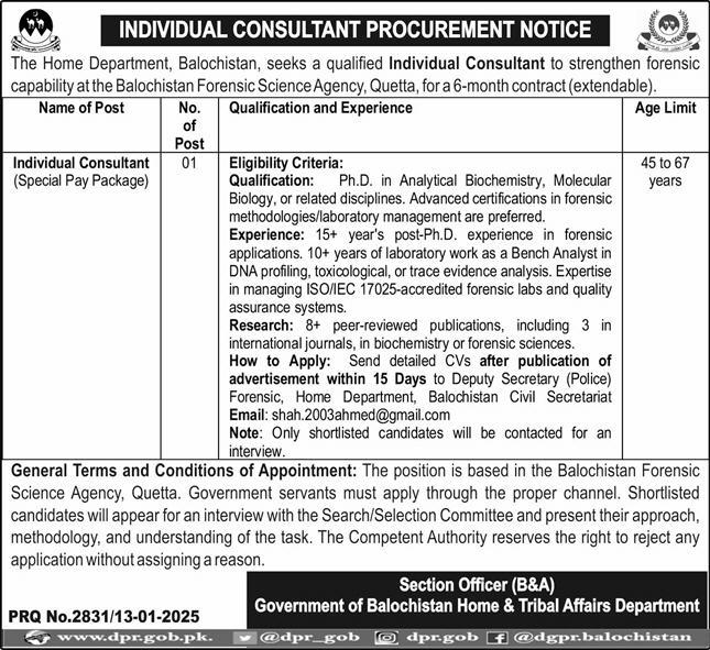 Vacant posts including individual consultant are announced in Home Department Quetta, quetta Balochistan Pakistan as per 14 January 2025 advertisement in daily Express Newspaper. Bachelor, Master and MS etc. educational qualification will be preferred.