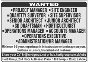 Horti Group Ferozepur Road Lahore, lahore Punjab Pakistan invites applications from eligible candidates for the post of Site Supervisor, Project Manager, Operation Manager, Three D Draftsman, Administration Manager, Site Engineer, Account Manager, Quantity Surveyor, Operation Executive, Horticulturist and Architect as per advertisement of November 3, 2025 published in daily Jang Newspaper. Preferred Education is Intermediate, Master, MS and Bachelor etc.