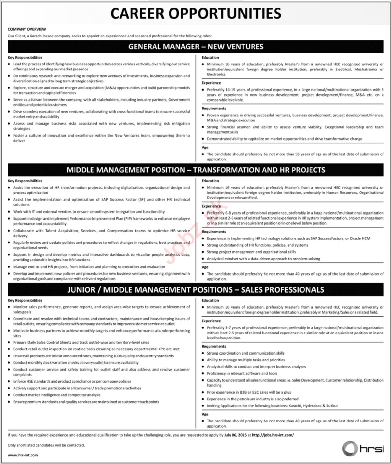 Human Resource Solution International HRSI Karachi, karachi Sindh Pakistan invites applications from eligible candidates for the post of General Manager New Ventures, Sales Officer, Transformation Hr Project Officer and Middle Management Officer as per advertisement of June 22, 2025 published in daily Jang Newspaper. Educational qualifications required Master, Bachelor and MS etc.