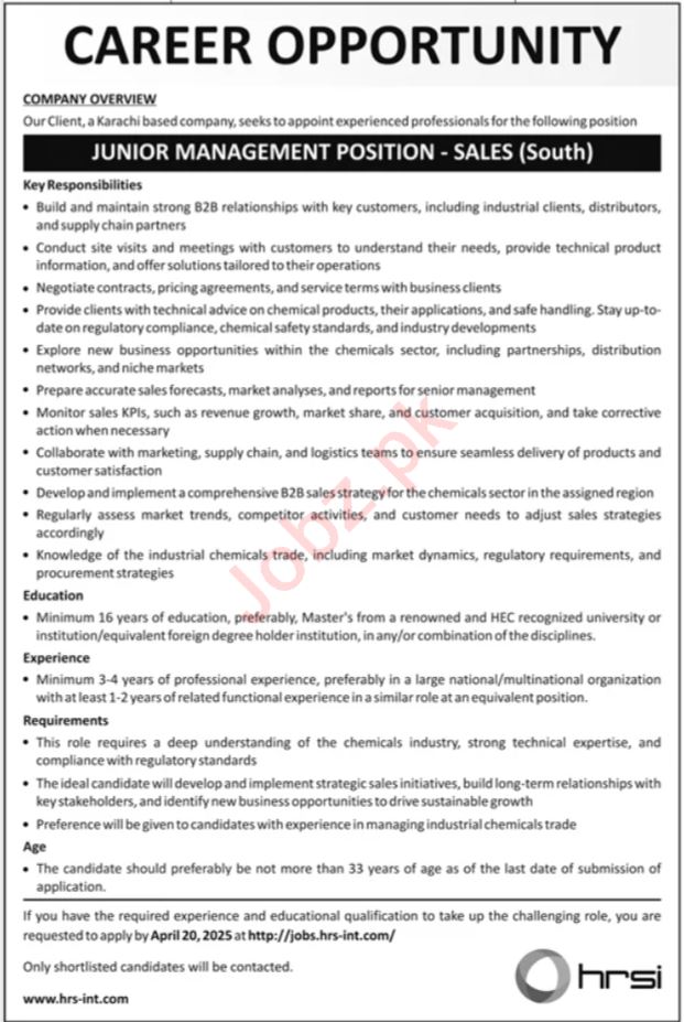 Human Resource Solution International HRSI invites applications for job positions advertised in daily Jang dated 6 April 2025 for following vacancies in Lahore, lahore Punjab Pakistan.