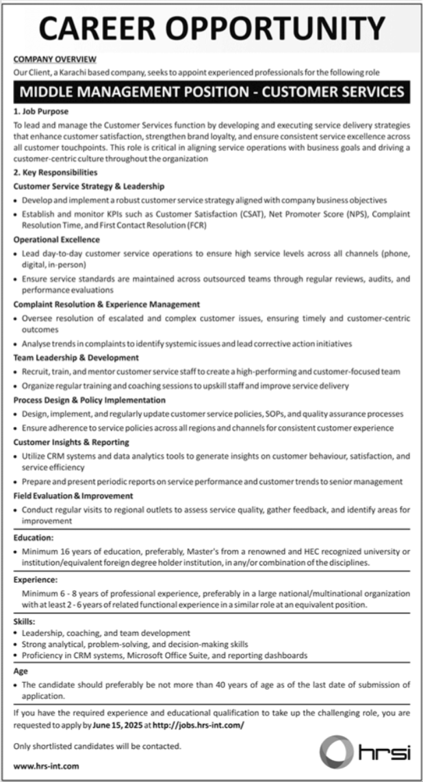 Human Resource Solution International HRSI jobs advertisement dated about 1 June 2025 in daily Jang Newspaper invites application for the vacant post of middle management position in Karachi, karachi Sindh Pakistan. Preferred Education is Master, Bachelor and MS etc.