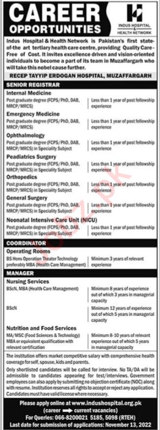 Vacant posts including coordinator, emergency medicine, orthopedics, general surgery, registrar neonatal intensive care unit, internal medicine, manager and registrar opthalmology are announced in Indus Hospital Muzaffargarh, muzaffargarh Punjab Pakistan as per 30 October 2022 advertisement in daily The News Newspaper. Educational qualifications required Matric, Intermediate, MBBS, Bachelor and Master etc.
