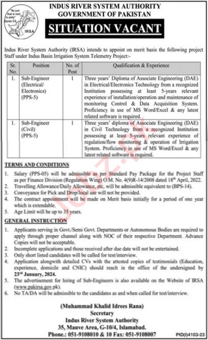 Indus River System Authority IRSA invites applications for job positions advertised in daily Jang dated 7 January 2024 for following vacancies in Islamabad, islamabad Islamabad Pakistan.