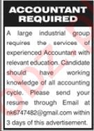 Industrial Group jobs advertisement dated about 5 May 2024 in daily Jang Newspaper invites application for the vacant post of accountant in Quetta, quetta Balochistan Pakistan. Persons with Bachelor etc. education can apply.