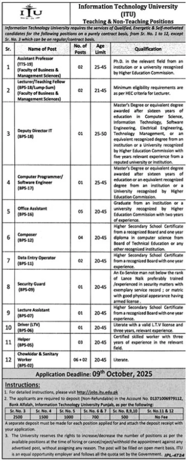 Vacancies in Information Technology University ITU Advertisement September 2025