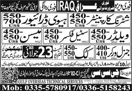 Vacant posts including cook, Welder, Heavy Driver, General Worker, Steel Fixer, Shuttering Carpenter and Mason are announced in Gulf Overseas Technical Services Baghdad, baghdad Iraq as per 20 July 2025 advertisement in daily Express Newspaper. Persons with Primary, Matric, Intermediate and Middle etc. education can apply.