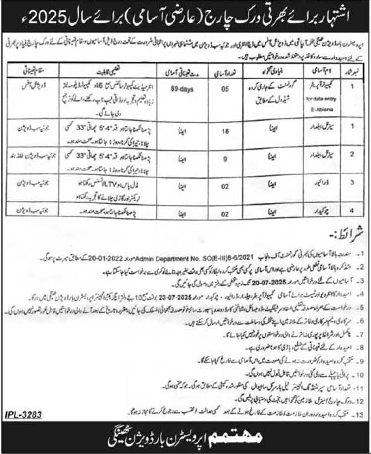 Irrigation Department Charsadda, charsadda Khyber Pakhtunkhwa KPK Pakistan invites applications from eligible candidates for the post of sessional baildar, driver, chowkidar and computer operator as per advertisement of July 11, 2025 published in daily Daily Pakistan Newspaper. Matric, Intermediate and Middle etc. educational qualification will be preferred.