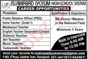 Vacant posts including science teacher, art teacher, taekwondo teacher, home teacher, english teacher, montessori teacher and public relation officer are announced in Islamabad Lyceum High School System Satellite Town Rawalpindi, rawalpindi Punjab Pakistan as per 24 March 2025 advertisement in daily Jang Newspaper. Candidates with Master and Bachelor etc. educational background will be preferred.