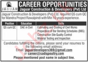 Jaguar Construction & Developer Pvt Ltd Mandra Rawalpindi, rawalpindi Punjab Pakistan invites applications from eligible candidates for the post of qs cum q as per advertisement of August 17, 2025 published in daily Jang Newspaper. Persons with DAE etc. education can apply.