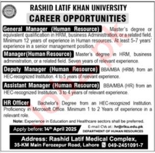 Rashid Latif Khan University jobs advertisement dated about 16 March 2025 in daily Jang Newspaper invites application for the vacant post of hr officer, deputy manager human resource, manager human resource, assistant manager human resource and general manager human resource in Ferozepur Road Lahore, lahore Punjab Pakistan. Educational qualifications required Master, BBA, MBA and Bachelor etc.