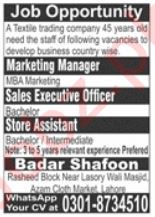 Vacant posts including sales executive officer, store assistant and marketing manager are announced in Badar Shafoon Fabric Manufacture Azam Cloth Market Lahore, lahore Punjab Pakistan as per 29 June 2025 advertisement in daily Jang Newspaper. Educational qualifications required Bachelor, MBA and Intermediate etc.
