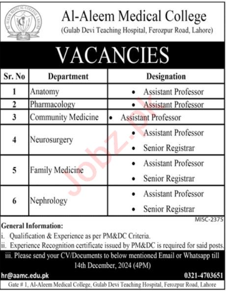 Vacancies in Al Aleem Medical College Advertisement December 2024