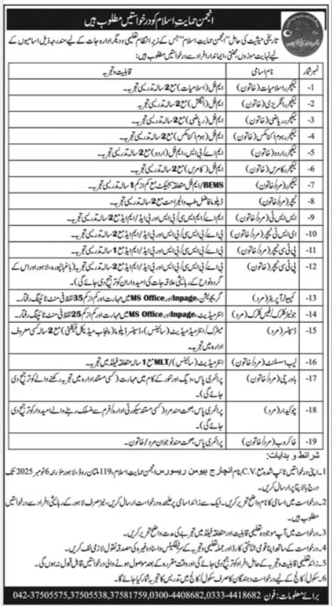 Vacancies in Anjuman i Himayat i Islam Advertisement October 2025
