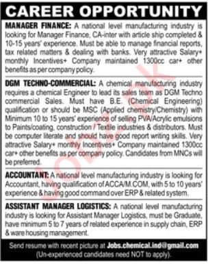 Manufacturing Industry jobs advertisement dated about 2 February 2025 in daily Jang Newspaper invites application for the vacant post of accountant, assistant manager logistics, dgm techno commercial and manager finance in Karachi, karachi Sindh Pakistan. Persons with ACCA, Master, Bachelor, M.com, CA, M.sc and B.E etc. education can apply.