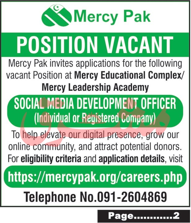 Mercy Pak Educational Complex GT Road Peshawar, peshawar Khyber Pakhtunkhwa KPK Pakistan invites applications from eligible candidates for the post of social media development officer as per advertisement of April 21, 2025 published in daily Mashriq Newspaper. Persons with Master and Bachelor etc. education can apply.
