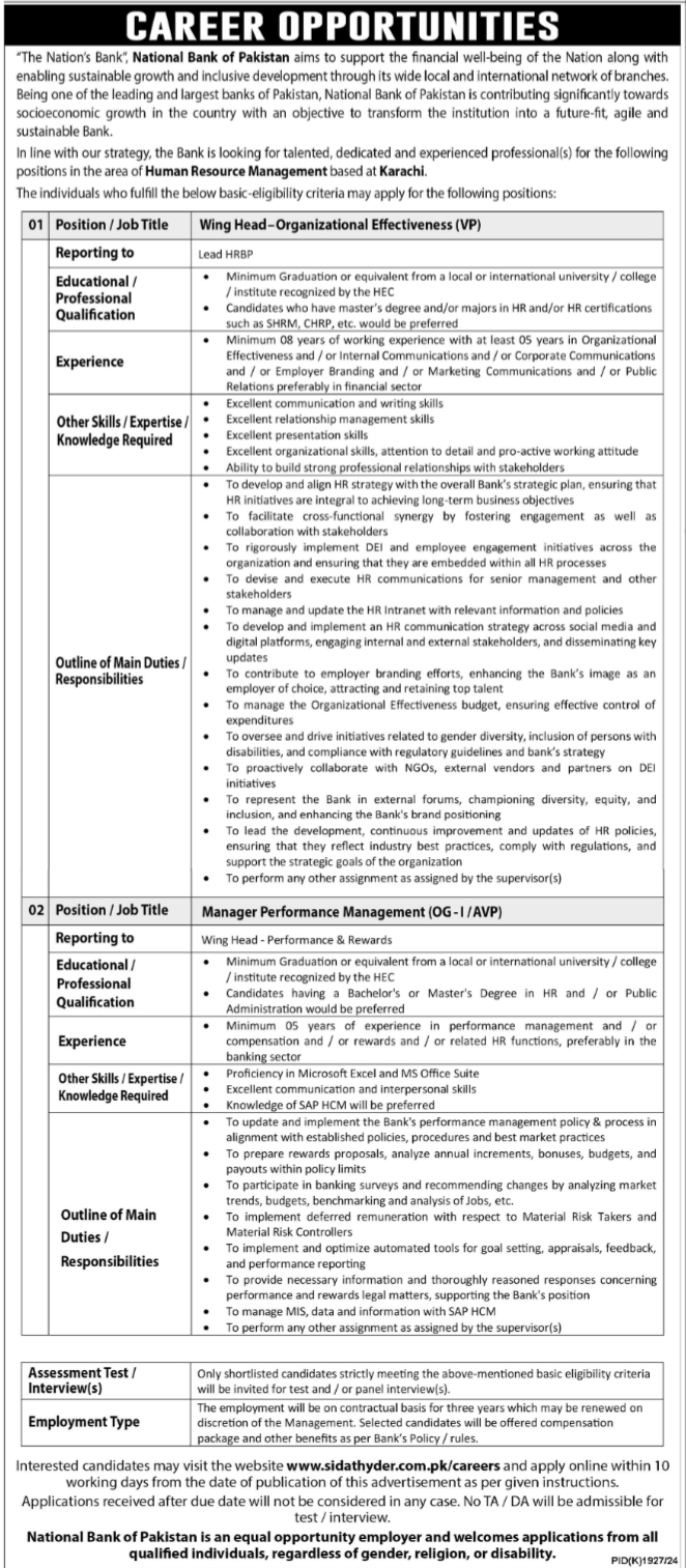 National Bank of Pakistan NBP Karachi, karachi Sindh Pakistan invites applications from eligible candidates for the post of manager performance management and wing head organizational effectiveness as per advertisement of December 22, 2024 published in daily Express Tribune Newspaper. Candidates with Master and Bachelor etc. educational background will be preferred.