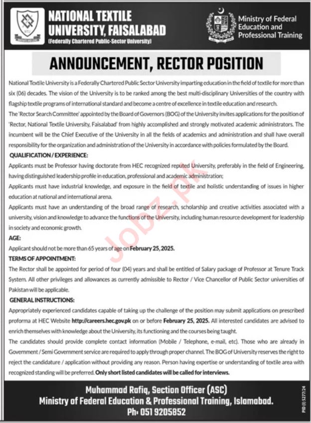 National Textile University jobs advertisement dated about 2 February 2025 in daily Jang Newspaper invites application for the vacant post of rector in Islamabad, islamabad Islamabad Pakistan. Candidates with Others, Mphil and Phd etc. educational background will be preferred.
