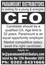 Paramount Distributors Company Lahore, lahore Punjab Pakistan invites applications from eligible candidates for the post of cfo as per advertisement of November 9, 2025 published in daily Jang Newspaper. Candidates with CA etc. educational background will be preferred.