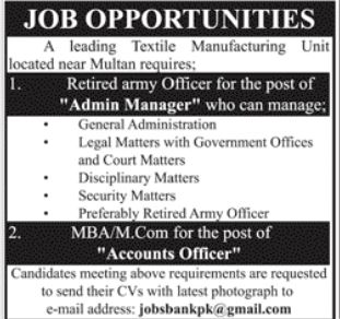 Textile Manufacturing Company Multan, multan Punjab Pakistan invites applications from eligible candidates for the post of accounts officer and admin manager as per advertisement of January 26, 2025 published in daily Jang Newspaper. Educational qualifications required MBA, Bachelor, Master and M.com etc.