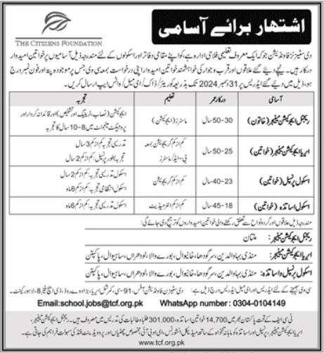 Vacant posts including female school principal, female regional education manager, area education manager female and school teacher female are announced in The Citizens Foundation Lahore, lahore Punjab Pakistan as per 22 December 2024 advertisement in daily Jang Newspaper. Persons with Master, Bachelor and Intermediate etc. education can apply.